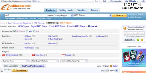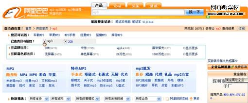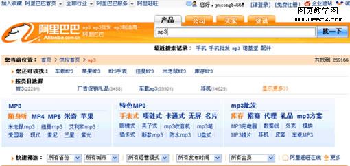 當用戶在首頁搜索框中輸入MP3時,點擊搜索按鈕進入LIST搜索結果頁面,將看到左邊為MP3相關類目選擇,右邊為搜索OFFER結果頁面.
