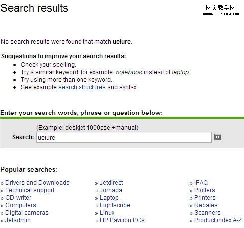 談了那麼多網站的無結果頁面設計,說到底它們還是有一些通用模式的,我還是想原引一個HP的例子來具體說明無結果頁面的布局.