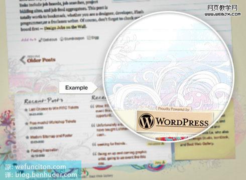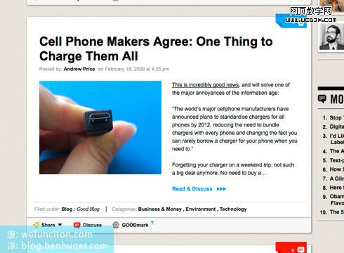 內容(Content) 應該是博客中出現在讀者眼前的首要部分(之一)。在下面的例子中,一個粉紅色粗體字的標題,很好地吸引了你的注意力,引導你直接關注文章內容。左側放了張大小合適的預覽圖,右邊則是兩三段文章摘要,和一個“繼續閱讀”的鏈接。當然,也有標准的日期和作者信息。這簡直就是我心目“內容設計”的完美實例。注意力(Attention) 可以被引導到任何有趣的事物上。在這個例子中,漂亮的RSS訂閱按鈕成為了焦點。且不說這個焦點讓讀者產生了與內容的聯系感,它還能幫助網站獲得更多的訂閱量。鼓勵你的讀者探索你的內容相當簡單,只需在邊欄上加一些最新文章或最受歡迎文章的鏈接列表,或者制作一個下拉菜單,或者組織一個其他你想要推送的內容的高效列表。做起來很簡單,效果卻足夠有效,尤其是對博客來說。博客是一個私人領地,通過不同的途徑告訴讀者你的聯系方式(Connect) ,能幫助他們了解你,也說不定會帶來意外的好處。