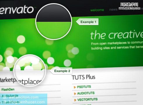 下圖的Example 1 (例子1)中,綠色內容框的邊緣有一條更亮的綠色線。而Example 2處,區塊內邊緣有柔和的漸變陰影,而邊緣之上還有一像素的白色描邊。這做法非常聰明,用陰影來強調高光。後面的綠色區域有非常柔和細微的光影效果,有助於將注意力吸引到下面的白色區塊中那清新脆爽的細節上去。 盡管這種做法並不是總能讓設計看起來更加精致,不過它們的確能幫助你賦予設計以三維的真實感。於是設計元素就成了鑲嵌在頁面上的寶石,而不是平鋪在上面的一張毫無動感的紙。
