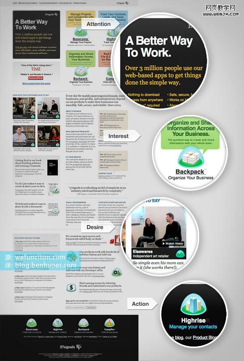 如圖中所示,他們提供了四大理由讓你購買他們的產品。吸引注意力(Attention)是第一步,他們做了一個黑色區塊,放上關於產品的簡單介紹,並且使用了粗大的標題。 接著,他們通過一些漂亮的插畫把你的興趣(Interest)吸引到對產品優點的介紹上。再然後,他們想要讓你產生購買需求(Desire),這能通過放置客戶評論引言和產品獲獎證書來實現。在這一實例中,他們是通過幾個“What our Customers have to say”(我們的客戶如是說)的視頻來實現的。最後要實現的即促成購買行動(Action); 37Signals 的網站上有大量行動點(action points,即引導用戶進行下一步操作的鏈接)貫穿於整個頁面,由於頁面很長,頁面底部還放置了更多的行動點。