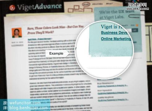 我從來不覺得越細微越好,任何細節的“細度”都以可見為前提。可能人們並沒有清楚地意識到,不過這些細節必定確實產生了影響。博客Viget Advance的例子中,在做舊與撕碎效果方面,能給我們一點啟發。 只是非常細微的做舊,不過如果沒有這效果,這張人造紙就會顯得平淡無奇,枯燥乏味了。正是這些小小的“不完美”讓這畫面顯得更可信,更真實。