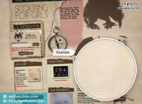 材質性背景要麼成全你的設計,要麼毀掉你的設計。很多復雜的背景除了分散讀者注意力,沒有帶來任何好處。最終使得設計品質大為降低。所以,最好還是一直保持你的背景材質細微而柔和。 Scouting for Girls的網站在運用材質打造整體風格和設計品質方面做得極好。