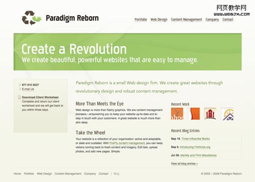 這個網站在960 Grid website上有展示。它的版面排列很連貫也很引人注目。我很欣賞它將主要內容整齊地排在左邊的做法,盡管有些大級別的頭部破壞了這個規則並排到了左側邊欄裡面。對留空的大量使用和字體反差大小的使用都非常不錯。