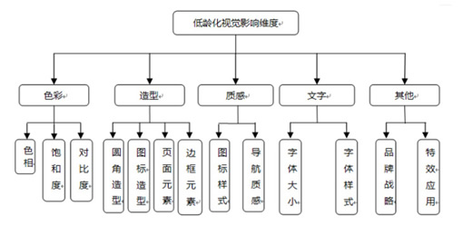 在大量研究內部以及外部一些視覺低齡化的網站的基礎上,發現事實上,的確低齡化很大程度會是設計不合理導向以及產品定位引起的,所以很有必要在設計之初就避免低齡化的設計傾向,從源頭上控制低齡化的蔓延。在對相關案例的分析過程中,我們對影響低齡化的視覺元素劃分了一下幾個大的緯度(圖3),從色彩、造型、質感、文字、其他等相關影響低齡化的視覺維度,提取相關的影響因子,通過這些相關的影響因子,利用大量有視覺沖擊力的反例來提醒大家,什麼樣的設計是低齡化以及非低齡化設計,希望能從感官上對設計師和產品經理在設計產品時起到幫助以及注意,相應的維度內會有一些相應的指導意見,最後有相應一些圖片映射,希望能感官上幫助設計理解低齡用戶群體的生活環境,在設計產品時多注意此類相關設計。最終輸出指引文檔,在指引文檔發布的同時也對指引文檔內的一些典型的問題提取一些設計小貼士供大家設計時參考。