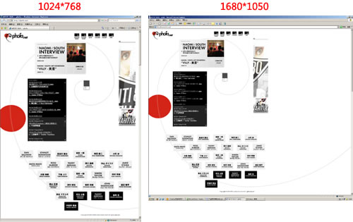 Phofa.net 是日本搞藝術的網站,下圖分別為首頁在1024*768和1680*1050兩種分辨率下的截圖對比。多屏拼接而成,可以清楚看到整體表現視覺風格與VI體系的完美融合,簡潔有力。
