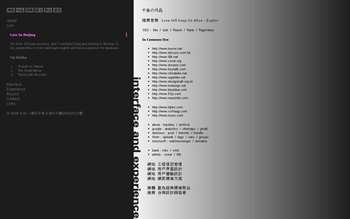 更早這個 05年設計的個人網站 是半成品,通過黃金分割比例實時自適應,可以在任何分辨率下都有最佳視覺效果。當時主要研究使用div做高級布局保證可訪問性,向下兼容良好,設計理念現在也不過時,前不久還看到有文章探討黃金分割。