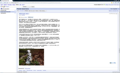 Google 的大部分產品界面都是自適應浏覽器寬度的, 產品不同, 具體做法也會有不同. 對於 application 性質的產品, 界面框架一般都是自適應的, 但為了保證裡面文本的可讀性, 往往會對文本內容區域限制一個最大寬度, 像 Google Reader 這樣: