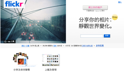 例如Flickr強調的是讓用戶在第一次浏覽網站時就有良好的用戶體驗,他不需要注冊就能看到朋友的照片,打開flickr首頁後會推薦一些網友發布的漂亮照片,用戶可以隨意浏覽並且使用flickr相冊的其他功能,等用戶覺得滿意後在顯眼的地方選擇注冊,而不是一種強迫性的推廣。