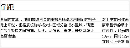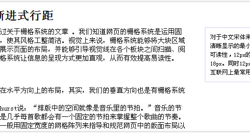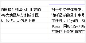 加上去後,我們發現,恩?怎麼沒有右邊文字沒有對齊到網格上呢?原來加上了補白和邊框後,邊注下移了9px,所以網格就沒有對齊啦。那麼,我們就要把邊注上移9px。現在,我們可以看到右邊的文字已經對齊到網格。是不是感覺不錯?