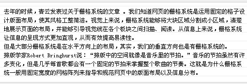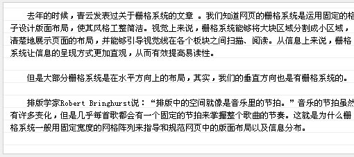 段落間加上段間距不但美觀,而且容易在視覺上區別各段落. 但是要注意的是,垂直韻律最容易被打破的地方就是兩個元素在垂直方向上的空白了. 所以,為了讓下一段的文字內容落在網格內,我們要將段落間距設置為基礎的倍數. 例如:我們可以設置段前距為9px,段後距為9px,9px+9px=18px;或者設置段前距(css margin-top)為0,段後距(css margin-bottom)為18px;或者段前距和段後距都是18px. 這裡,我們選取第二種方案,即,設置段前距為0,段後距為18px. 圖中可以看到,每段段落的文字都落在了格子內. 關閉網格可以發現,段落清晰明了,比之前容易閱讀多了.