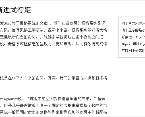 網站我們常常有側邊欄,我們這裡就用右邊的邊注來代表。在這裡的例子中,我們和正文一樣設定邊注的排版:字體12px,行距18px。正是由於我們前面的努力,我們可以看到,邊注的基線和正文的基線是對齊的。關閉網格可以看到,由於基線的對齊,整個排版有條不紊,十分美觀。