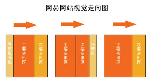據研究分析用戶浏覽網頁的視覺一般是從左到右、從上至下的一個浏覽習慣。網易網站的架構也在往這個方向改進,不斷的提升用戶體驗。網易資訊類頁面大致可分為3類架構,下圖是3類架構的視覺走向圖。