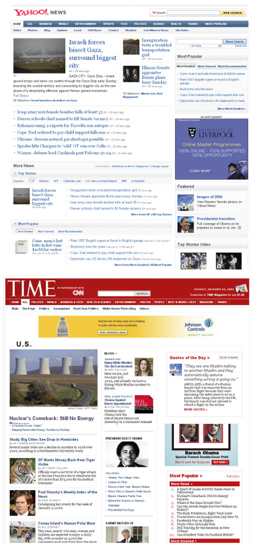 Yaho新聞使用的是立體效果的設計,time是以線條為主的設計,2者給人感覺是簡潔清晰沒有多余的東西,既突出了資訊內容又不失美感。