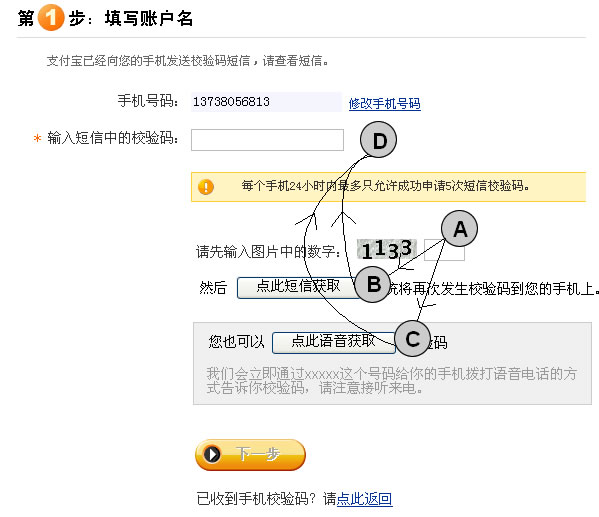 支付寶的手機注冊(獲取第二次手機驗證碼後的頁面)