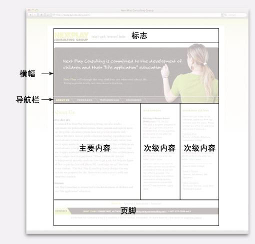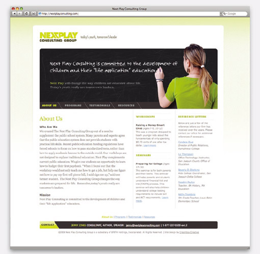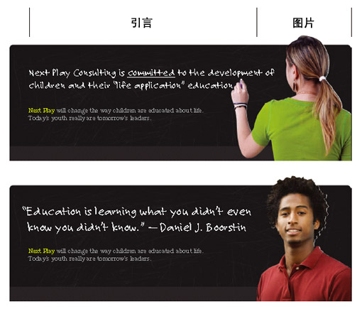 黑板樣式的網頁橫幅是一個強有力的視覺元素,我們對黑板的視覺聯系都非常熟悉,畢竟我們都曾經無數次看著它度過我們的青春。黑板本身就具有尺寸大、醒目(黑白強烈對比)的視覺特性,而且,它還放在最上面。在這個背景中,NEXT PLAY用文字及圖片向觀眾作介紹。一個學生拿著粉筆明確無誤地給人一種教室的感覺,而且上面這一句關於機構的“我們是誰”及“我們是做什麼的”從下方正文中抽離出來被單獨放在上面,可想而知,如果僅是出現在下方的正文中,它只會淹沒在文字中。