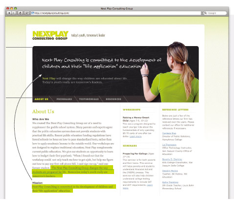 Next Play咨詢集團是一家主要面向公立學校進行學校課程以外的補充教育。公立學校一般的教育重點只是幫助學生如何應付各種各樣的考試和測驗,而Next Play則教導學生將一些理論知識應用到實際的生活中——讓學生掌握求職的各種挑戰、涉足社會時如何理財等等。真是一個朝陽行業。