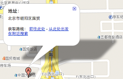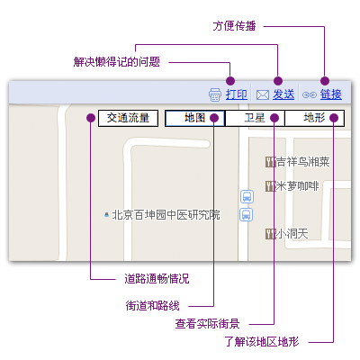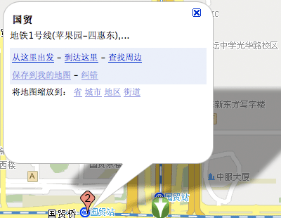 從上圖比較來看,地標提示框除了標明地點外,”到這裡去,從這裡出發,周邊搜索”是其主要功能.這幾個功能是較紙制地圖最大的優勢所在.傳統地圖只能告訴我們地點在哪,而電子地圖解決了我們最關心的問題–怎麼去!