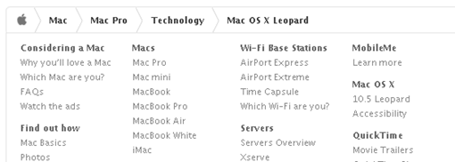 Bread Crumbs導航:面包屑導航告訴用戶他當前的操作位於整個網站的具體位置。Apple在每一頁面的底部都提供了這樣一個位置導航功能,對於希望無障礙地快速網站的用戶來說非常有用。