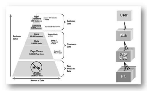 那麼我們能從日志中得到哪些基礎數據呢?看看下面這個圖,縱向的把收集到的數據進行分析並劃分了幾個層次,這個圖也描述了一個目前很廣泛使用的基於日志的統計分析步驟:日志文件->PV->會話->使用者->客戶->忠實客戶,我們可以明顯地看出,金字塔越上層的數據就越具有商業價值。