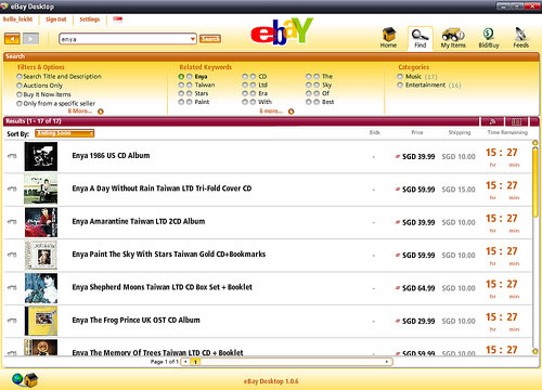 ok,這就是搜索完顯示的界面,其實通過頁面切換你會發現這個頁面正是Figure2中主頁面右上角的第二個圖標“Find”的頁面,下面就是搜索的結果,而上邊的那一塊是從搜索結果中篩選,也就是設置filter(過濾器)來進行精確查找,這個頁面有兩個東西需要介紹和提出異議(以後陳述)。要介紹的是我們可以通過中間暗紅條右側熟悉的feed按鈕來把這次搜索進行訂閱,後面你就會發現這個feed的功能還是很強大的,不光會提供“搜索關鍵詞”的feed,還能訂閱賣主的相關信息,關注賣主的貨品動向。而這些,都會在主頁面的左上側“My Favorite Searches”模塊中顯示,方便你隨時查看,怎麼樣夠貼心了吧。