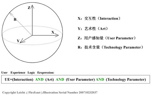 對於這個球體,有一點需要補充,就是這個球體對於三維坐標的關系,我認為坐標系中每一維的量級不一樣,衡量標准不一樣,盡管每一個值可以定義為0至1的取值,但是還是有所不同的,所以圖示的三維長短我畫的很隨意。而球體的意義在於他脫離了坐標系,它的的半徑大小將對其他三個因子得出的值的空間張度進行限制,也就是說技術含量約束了用戶體驗值的感覺值。如果坐標中有一維與球體表面相交,我倒認為這沒有什麼意義,但是絕對不能超出球體,這其實只是概念上的表示。
