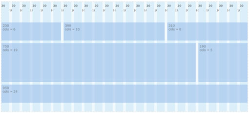 淘寶的首頁(截圖)目前尚未嚴格遵守柵格系統,如果重構的話,寬度方向可以考慮采用下面的柵格布局(只考慮頁面主體部分,忽略高度的比例):