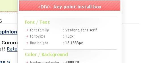 一款小巧的CSS屬性查看器,隨著鼠標的移動顯示當前所指示元素的CSS樣式信息,其中包括了所有從父級元素繼承而來,用戶自定義以及浏覽器自定義的樣式信息. 同Style Sheet Chooser II 一樣,你也可以通過在工具欄添加該擴展的圖標按鈕來激活/禁用該擴展。