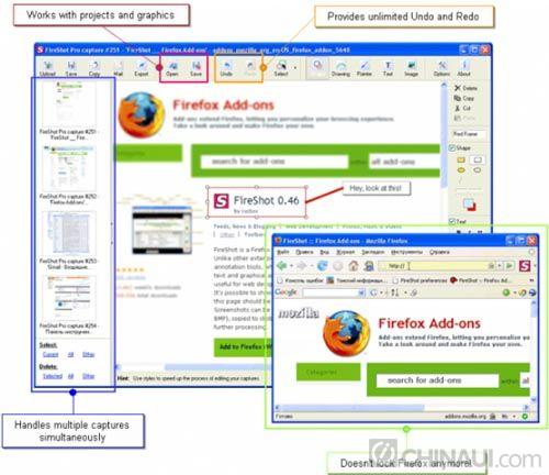 FireShot能夠方便的創建頁面的截圖[略縮圖],相比於其他的擴展,FireShot提供了一系列的編輯和注釋工具,方便你快速的修改所捕獲圖像或者添加文本,圖像注釋. 這些功能對於網頁設計者,測試者,和浏覽者都很有用, 此外用戶還可以自己定制所要捕獲的范圍,是頁面全部還是屏幕的可見部分