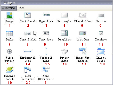 wireframe線框圖工具:基本上對應著web頁面中的各種圖形。針對頁面中交互行為的表達,Axure RP專門增加了image map region 圖像映射區、dynamic panel動態面版、menu(vertical/horizontal)水平/垂直菜單等幾個特殊的工具。