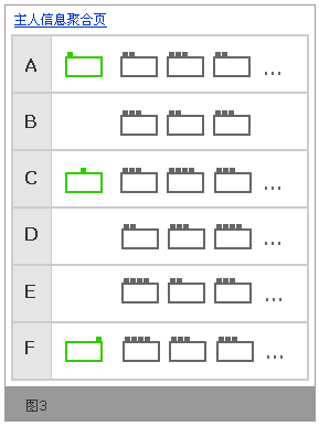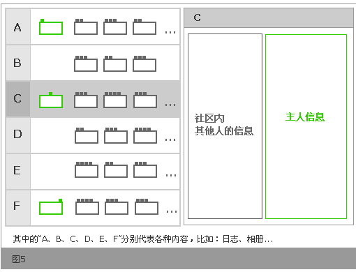 既然主人頁面中有個“日志”,社區平台也有個“日志”,那就合並成一個好啦。“我自己”就沒啦,全部的構架就只剩下一個按內容分類的結構了。因為主人的信息是打散到各個ABCD…欄目中,這就需要給主人一個自己有關所有自己的聚合頁面—主人的首頁。方便用戶查看所有與自己有關的所有信息: