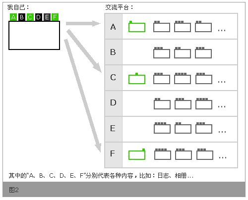 圖中右半部分是社區平台,以內容為維度,展示內容,進而展示用戶。比如,A代表日志,社區平台上會有個日志欄目,其中展示出很多有意思的日志,要看這篇日志,就到達另外一個人的blog了。交流實現了,所謂平台,價值也就在於此。