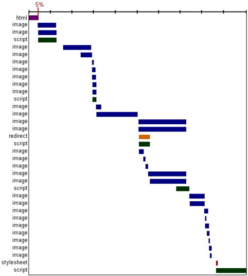 以上圖標的第一個標簽就是html,是一個html文檔最開始加載的東東,在這個例子中,讀取html代碼只占了整個響應時間中的5%,這個結果適用於絕大多數網站,在采樣美國的前十位網站中,只有一家超過5%但少於20%,其余80%的時間是用來讀取網頁其他內容的,也就是說,前端(原文是front-end,意思就是不包括html代碼的其余內容,可以是圖片,腳本,flash,視頻,各種東西)。這就是為什麼我們要把目光集中在這些東西來提高顯示速度的關鍵原因。