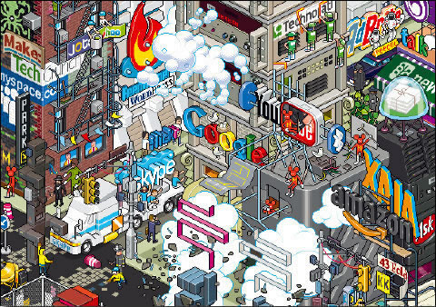 如果你覺得上面的Web2.0平面交通圖不夠過瘾,可以看看同一個作者設計的著名Web2.0網站立體交通圖。點擊這裡 可下載這幅更牛X的圖的pdf文件,點擊這裡 查看可點擊版本。
