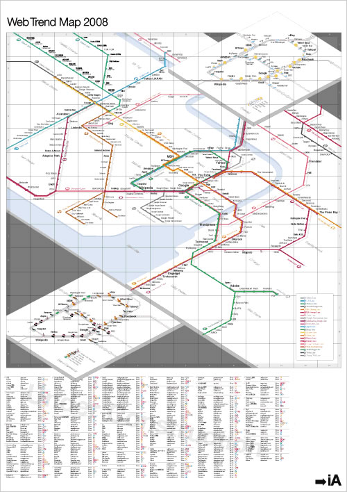 這張圖非常牛X,不同顏色的線路有不同的含義,線路兩端的網站有著一定的關系。你可以 點擊這裡下載1600*1024大圖 ,也可以 點擊這裡 查看可點擊版本。