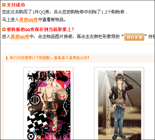 QQ秀商城中,單獨購買了一件QQ秀後,成功頁面上會根據用戶的性別推薦更多的整套裝扮: