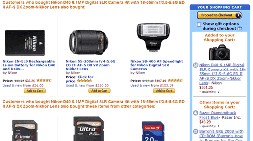 把一台數碼相機放入購物車後,他們推薦了很多商品,“買這件商品的顧客還買了:”、“買這件商品的顧客還在其他分類裡買了:”…林林總總推薦了一大篇。