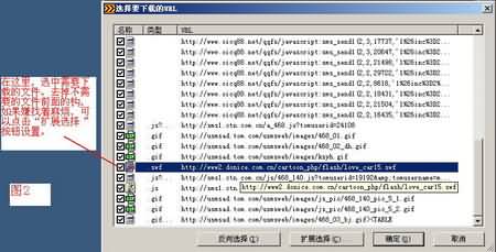 可以這樣:點擊Flash所在的頁面,按Ctrl+A“全選”,然後在被選中而變顏色的對象上面(一般是文字,圖片等)拖到懸浮窗口裡面,馬上就出現“選擇要下載URL” 的窗口(如圖2)。在裡面你可以隨心所欲的選擇要下載的文件,打上鉤就可以了。