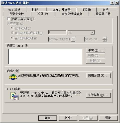 再進入了HTTP標題設定部分之後,會出現如圖1.4所示的畫面,在HTTP標題設定部分包含了四種不同的設定,分別是:啟用內容限制服務,用來設定某些特殊的目錄中的文件權限,以及自定義HTTP標題,用來設定自定義HTTP header meta資料,第三個是內容分級。可以將一個目錄或站點中的文件內容設定為內含某種等級的文件,例如暴力、性、不當文字與言語等,第四個部分就是我們現在要設定的部分:MIME對應,將某個特定的擴展名與MIME type。