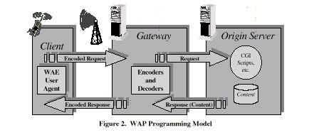 WAP網絡架構由三部分組成,即WAP網關、WAP手機和WAP內容服務器,這三方面缺一不可!其中WAP網關起著協議的‘翻譯’作用,是聯系GSM網與萬維網的橋梁;WAP內容服務器存儲著大量的信息,以提供WAP手機用戶來訪問、查詢、浏覽等。Figure 2(圖2)表明了WAP網絡的基本架構。當用戶從WAP手機鍵入他要訪問的WAP內容服務器的URL後,信號經過無線網絡,以WAP協議方式發送請求至WAP網關,然後經過‘翻譯’,再以HTTP協議方式與WAP 內容服務器交互,最後WAP網關將返回的內容壓縮、處理成BINARY流返回到客戶的WAP手機屏幕上。編程人員所要做的是編寫WAP內容服務器上的程序或曰WAP網頁。當然,要詳細地講解是要花很長的篇幅,如果你有興趣,可訪問WAP論壇。