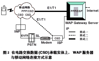 第一種形式是經典方法,CSD經過一系列的中間轉換(依次經過IWF、PSTN、MODEM),最後由ISP提供與WAP網關服務器的IP連接;
