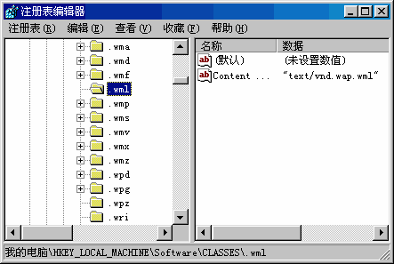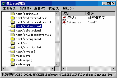 2.在HKEY_LOCAL_MACHINE/Software/CLASSES/MIME/Database/Content Type/中加入主鍵text/vnd.wap.wml,加入串值Extension,內容為.wml