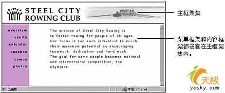例如,最常見的框架布局在頂行有一個框架(框架中顯示公司的徽標),並且在底行有兩個框架(一個導航框架和一個內容框架)。此布局要求嵌套的框架集:一個兩行的框架集,在第二行中嵌套了一個兩列的框架集。