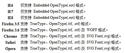 之前對“在網頁中嵌入非系統自帶字體”做過一點研究,雖然技術上能實現,但是對國內來說,沒有太大的實際意義,因為一個中文體文件起碼20M+,而且各個浏覽器支持的字體文件還都不一樣,也就是說,在服務器端必須有2-3個不同格式的字體文件,用來應付各個浏覽器,可以看下下面這張對應圖。