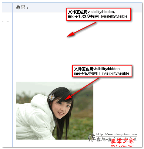 何時隱藏“失效”?很簡單,如果子孫元素應用了visibility:visible,那麼這個子孫元素又會劉謙般地顯現出來。