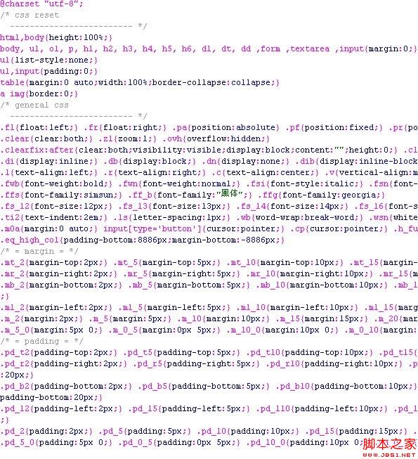 1.Css通用庫(global.css):該樣式表可以在所有的網站上使用,只要是個網站,就可以導入這個樣式表。它涉及css各個方面,比如css重置樣式、css的布局樣式、邊距、字體、字號、對齊方式,css通用庫是css樣式分離原則的直接體現(這裡說的樣式分離和接下來要說的樣式組合原則是兩個較為復雜的概念,要很好地理解需要另外的篇幅來解釋,所幸這樣的文章還是有的,有時間可以看看前端牛人張鑫旭的博客文章:css樣式分離之再分離、css樣式合並與模塊化。我的css通用庫跟網上可見的大同小異,您如果有需要,可以直接在張鑫旭的相關文章中找到。下面附上我的css通用庫截圖: