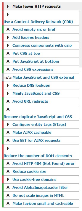 YSlow有一套檢驗頁面性能的標准,它會根據標准裡面的每一條來檢測這個網頁,並且根據情況對該網頁給出評級和建議。如新浪首頁得到的評級和建議分別是: