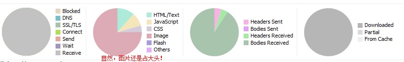 圖片還是占了很大一部分頁面流量。另外,JS和頁面文本本身的大小幾乎是相同的,說明3g新浪還是很倚重js的。