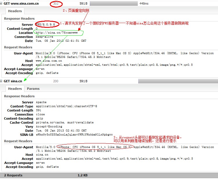 可以看到頁面請求先被發送到了一個PWS服務器(微軟推出的個人web服務器)上,然後該請求被重定向(狀態碼302)至另一個地址(http://sina.cn)。這些不是關鍵,看到下面的Request頭部中,user-agent給出了發出這個請求所在的設備以及該設備運行的操作系統類型。可以猜想新浪就是利用了這個信息來做判斷,以提示用戶轉用觸屏版的sina。