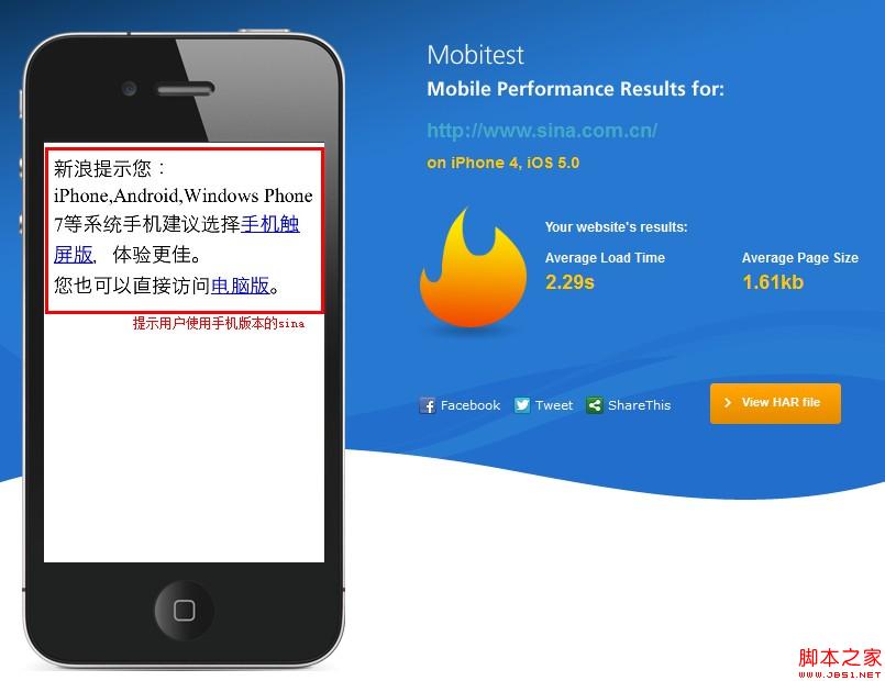 可以看到,頁面會出現一個提示,建議用戶使用手機觸屏版的新浪。